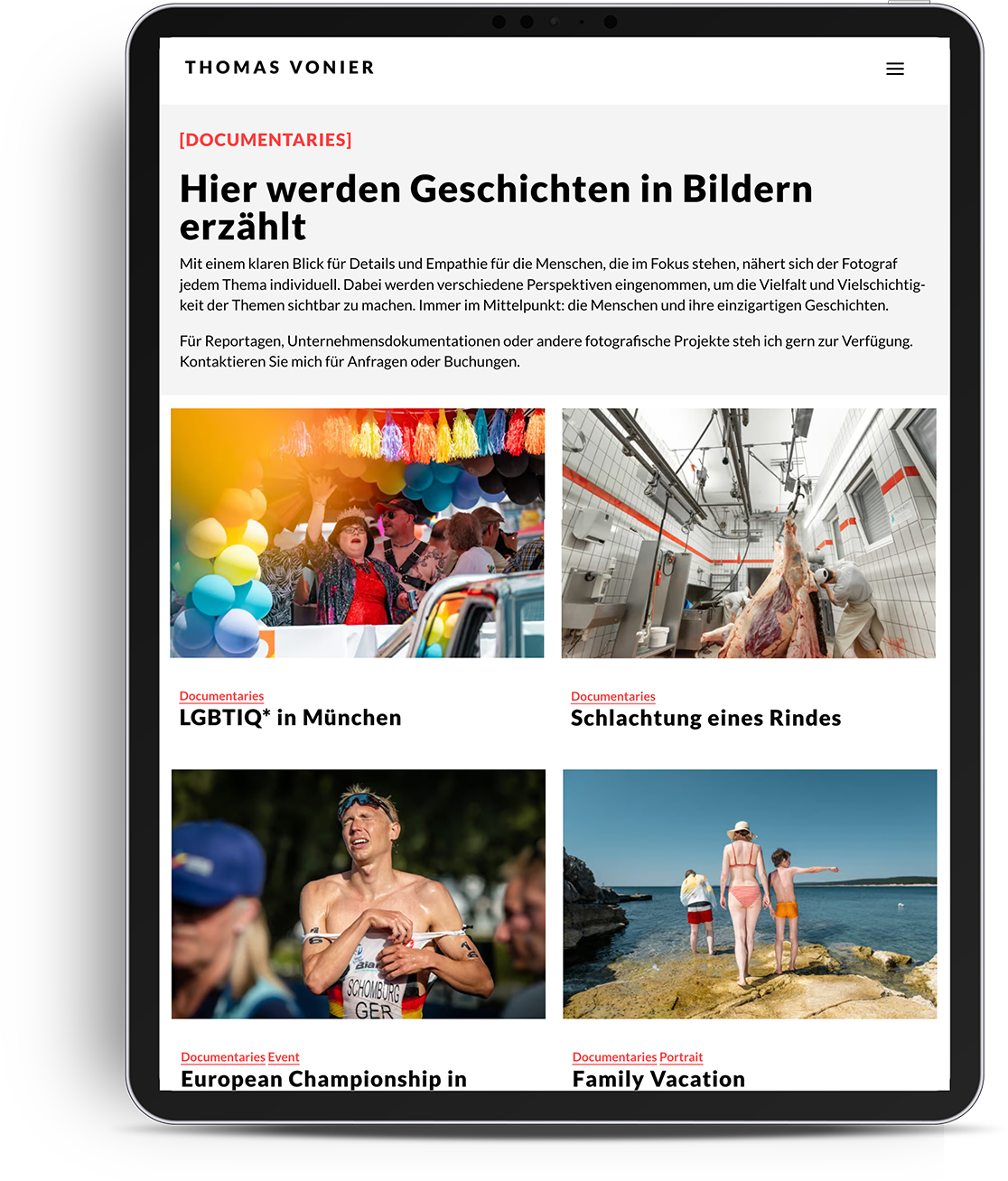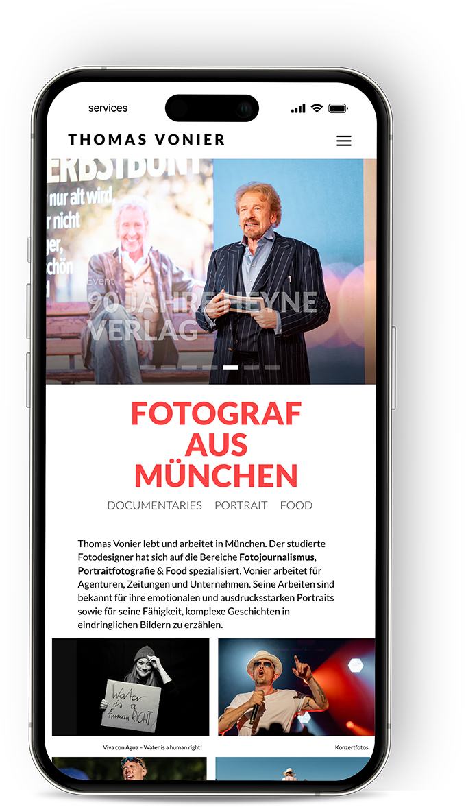 Thomas Vonier aus München ist ein professioneller Fotograf und Fotodesigner, der sich auf die Bereiche Reportagefotografie und Portraitfotografie spezialisiert hat. Seine Arbeiten sind bekannt für ihre emotionalen und ausdrucksstarken Bilder, die komplexe Geschichten erzählen und für Unternehmen, Agenturen und Zeitungen entstehen.