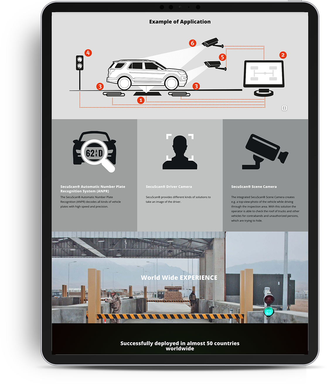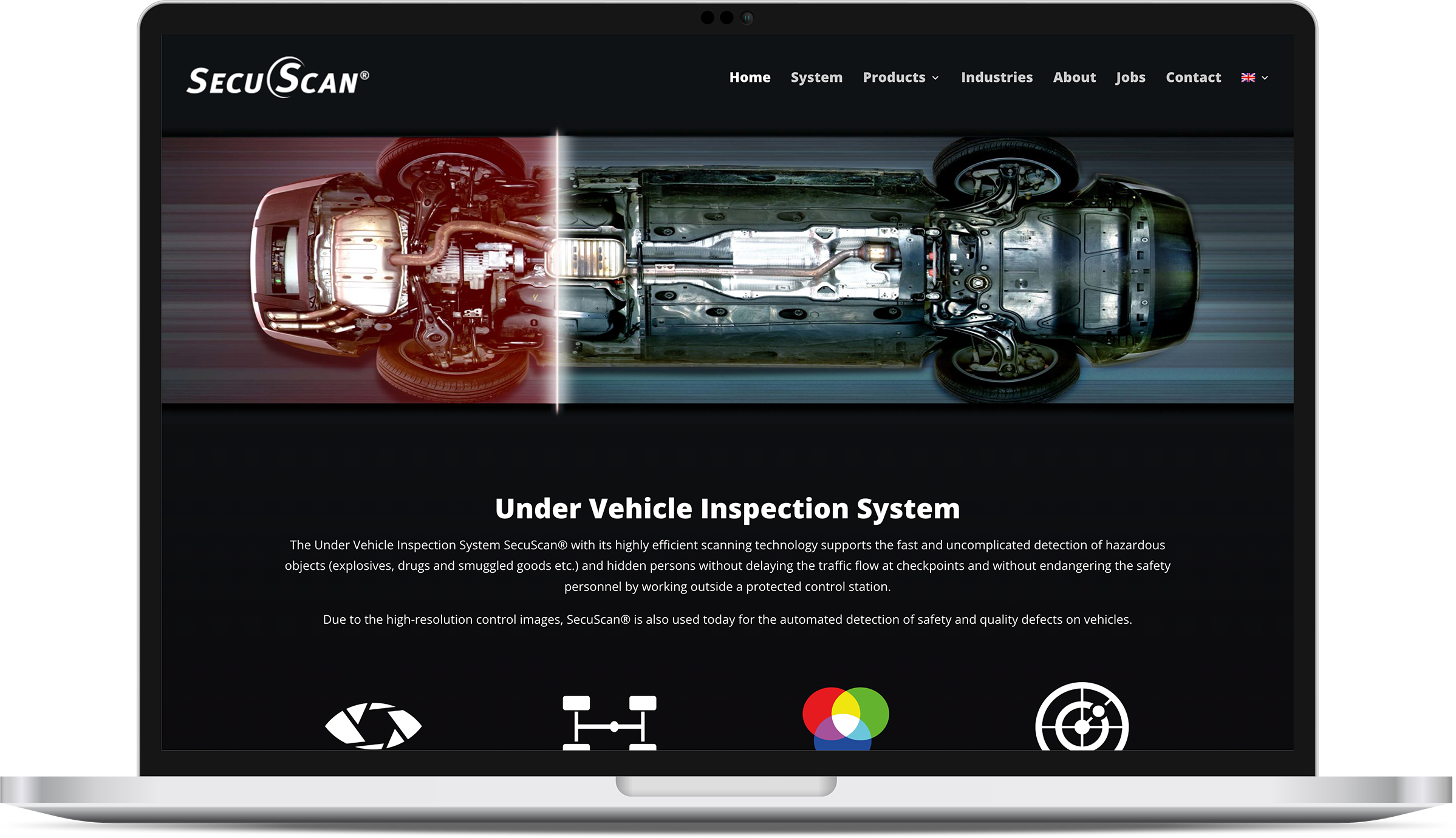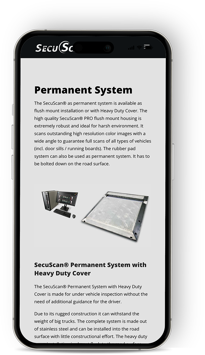 SecuScan ist ein System zur automatisierten Kontrolle von Fahrzeugunterböden, das entwickelt wurde, um sicherheitsgefährdende Gegenstände wie Sprengstoff, Drogen oder Schmuggelware schnell und ohne Verkehrsbehinderung aufzuspüren. Es erzeugt Bilder des Fahrzeugunterbodens, vergleicht diese automatisch mit früheren Scans und markiert Abweichungen zur einfachen Erkennung für Sicherheitspersonal. Neben dem Unterbodenkontrollsystem bietet SecuScan auch automatische Kennzeichenerkennung und Fahrer-Kameras an, die in Sicherheitsbereichen wie militärischen oder zivilen Hochsicherheitszonen eingesetzt werden.